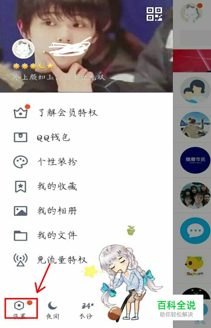 首先我们登陆qq界面,向右滑动就可以看到一个设置按钮,我们点击左下角的设置按钮,如图所示。
