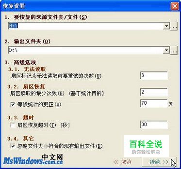 在CDCheck程序界面中单击“恢复”按钮,打开“恢复设置”对话框。分别指定要恢复的来源文件夹/文件和输出文件夹,并单击“继续”按钮,如图2010041666所示。