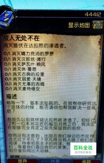 魔兽世界7.0卡德加宠物任务(敌人无处不在)攻略 任务由世界任务箱子开启触发。需要击杀列表里所有boos。 该任务难点在于,第8位任务NPC(麦特修女)位置难找。以及 BOSS生命力高,技能攻击力强悍很容易对玩家照成秒杀。 先说如何应对BOSS: BOSS生命高,攻击高,显然需要至少2名玩家,辅助才可以顺利击杀。再这里重点讲下找不到辅助玩家,需要自己单杀得窍门。 召唤BOSS后,迅速拖着任务怪放风筝,一路引到达拉然下水道入口处,这里一般有大量玩家聚集。将怪拖过去后,依靠众多玩家迅速击杀便可。 第8位任务NPC(麦特修女)在达拉然武器店二楼便可找到,对话后,使用上面讲到得方法迅速击杀便可完成任务。 任务完成后,获得奖励:神奇的智慧之球(宠物)