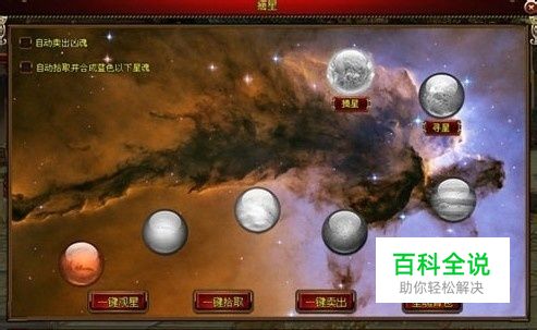 一键卖出:玩家点击一键卖出按钮,发出一键卖出指令,已猎取全部废魂自动卖出,玩家获得相应铜币一键拾取:玩家点击一键卖出按钮,发出一键拾取指令,系统会做出以下判定:星魂背包中是否有足够空格有则已获得的星魂自动移动到星魂背包中无则移动背包空格数的星魂,系统提示“空间不足,剩余星魂移动失败”一键观星:玩家点击一键观星按钮,发出一键观星指令,自动获得临时星魂背包剩余数量的星魂,当星魂数量等于临时星魂背包空余格数的时候,提示“空间不足,观星失败”自动卖出废魂:此项为勾选框,勾选之后,会自动卖出观星得来的废魂,系统开放初始即有此功能自动拾取并合成蓝色以下星魂:同样为勾选框,会自动拾取并在星魂背包内合成蓝色或蓝色以下品质的星魂,同样为系统开放初始即有此功能
