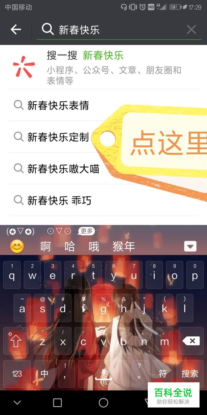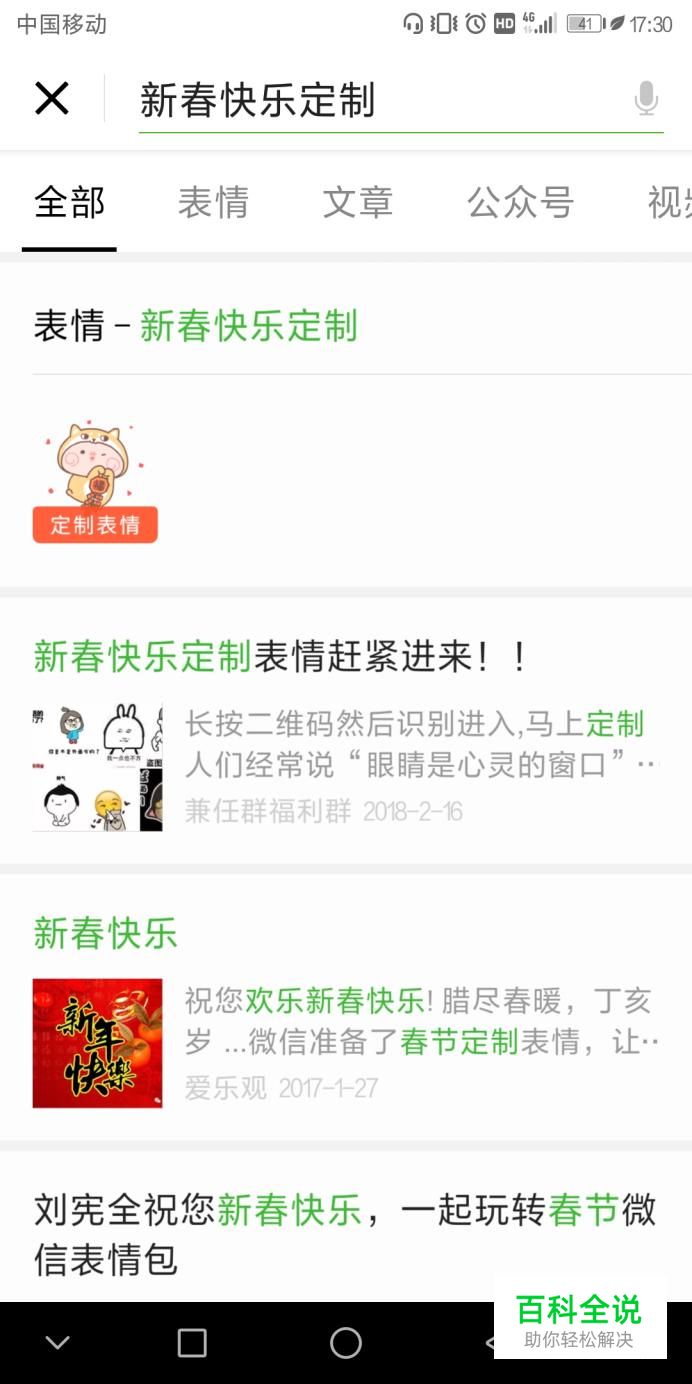 以“新春快乐”为例。 打开微信,点击搜索,输入“新春快乐”,然后点击“新春快乐定制”