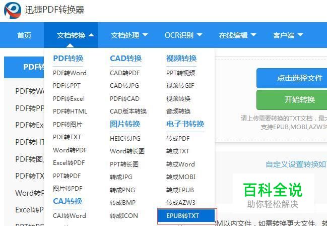进入在线操作界面后。在菜单栏上的操作功能中找到文档转换下的电子书并点击EQUB转TXT选项。