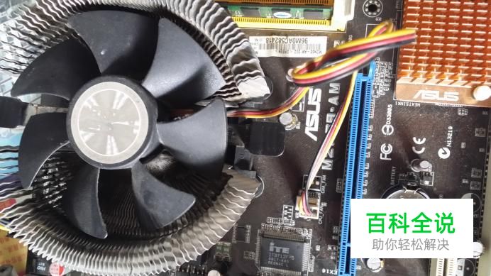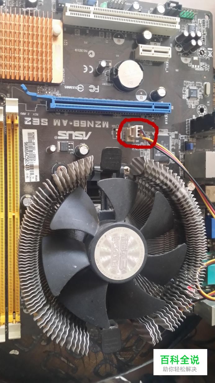 如图的风扇使用扣具扣在CPU底座的,它有一个插头插在主板上,把它拔下来。