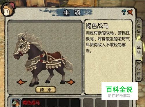 坐骑信息栏将显示当前角色拥有的所有已登录坐骑以及每种坐骑的详细介绍。坐骑可拖放至游戏界面右下角快捷栏内使用哦。