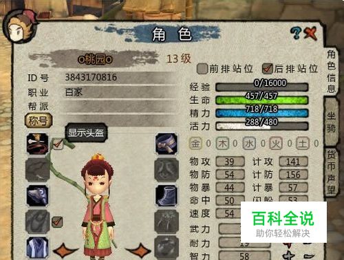 角色信息包括昵称、等级、职业、所属帮派、称号、各项状态值、各种属性值、以及装备明细。玩家可以通过角色界面右上角的前排占位和后排站位勾选战斗时的站位方式。当玩家升级后,会获得5点自由潜能分配点数,点击右下角武力、耐力、智力、敏捷、技巧5中属性后的“+”号可以添加属性点,“—”号减少属性点,点击确定按钮完成属性加点。在装备明细区头部、披风、时装旁分别有勾选项,可以决定是否显示这些装备。