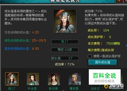 1.老实法。何为老实法,就是老老实实的用成长符去提升成长的方法,简称为老实法。哈哈!这种方法用的人比较多吧!需要注意的是,一般用成长符提升到29或者29。5就要开始用成长保护符啦!我一般到29就开始用比较保险,成长要提到29也不是一件容易的事!运气不好给你100张成长符可能也提不到29。所以我的意见量力而行,而成长保护符有的人也不多,只能开金人才能有大量的成长保护符!我相信大部分拥有蓝将的玩家都是这么提上来的!