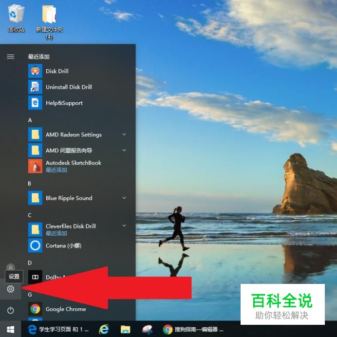我们首先单击电脑桌面左下角的开始图标,点击进入“设置”,如下图所示。