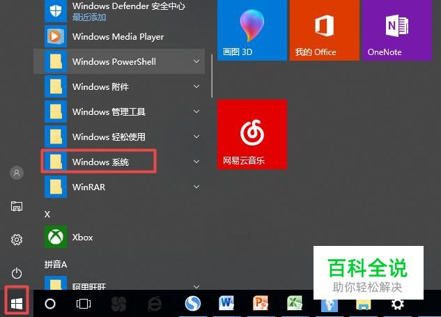 首先,我们点击电脑左下角的微软按钮,弹出的界面,我们下滑界面,找到windows系统,然后点击它;