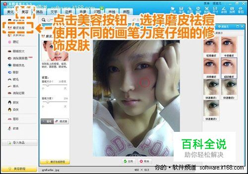 在软件下打开待处理的照片,进入“美容”菜单下,选择“磨皮/祛痘祛斑”功能,使用不同的画笔力度和大小,仔细的修饰脸部皮肤。 ▲图2