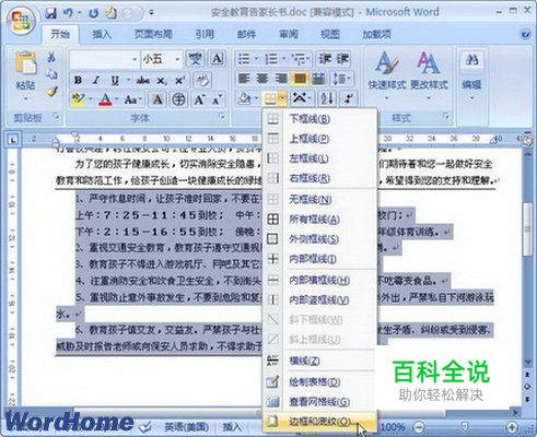 第1步,打开Word2007文档窗口,在“开始”功能区的“段落”分组中单击“边框”下拉三角按钮,并在打开的菜单中选择“边框和底纹”命令。