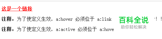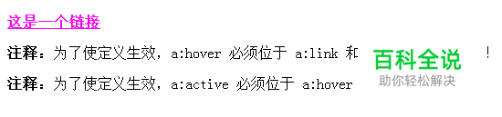 a:link {color:#FF0000;}/* 未被访问的链接 */ a:visited {color:#00FF00;}/* 已被访问的链接 */ a:hover {color:#FF00FF;}/* 鼠标指针移动到链接上 */ a:active {color:#0000FF;}/* 正在被点击的链接 */ 默认色: 鼠标移动上去: 访问之后: 正在被点击: