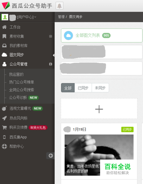 第二步,点击【图文同步】,找到对应的页面。一般情况下,我们要么是在西瓜助手上,找到相应的文章,然后直接同步;要么从外部添加文章。在这里都支持,因为后者比较简单,此处就着重分享前者的操作。