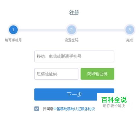 第一步是填写手机号,然后点击“获取验证码”,再把发送到你的手机的验证码输入,点“下一步”。