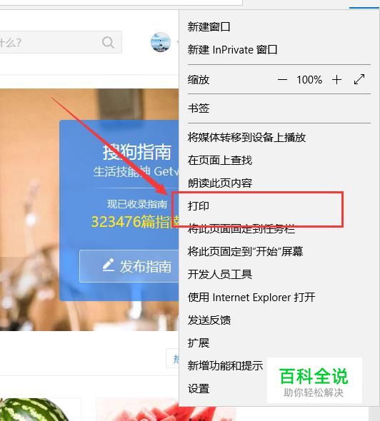 点击浏览器右侧功能栏,打开功能菜单栏,找到“打印”功能,点击并进入,如图所示。