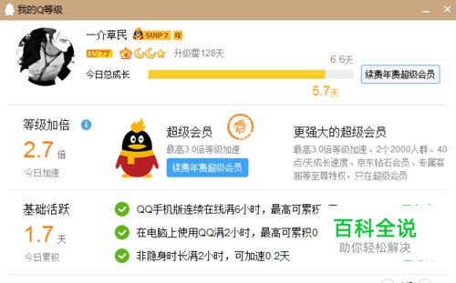 QQ是以活跃天来计算等级,目前每天最高可获得7.1天。