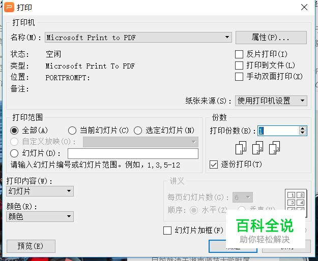 打开打印的设置页面之后,将打印内容改为“讲义”,这样就可以一张纸打印多张ppt。
