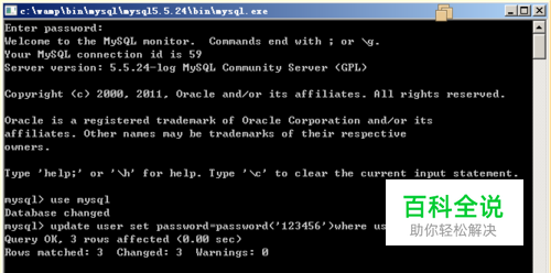 一:修改数据库密码 1、点开MySQL console进入数据库编辑框,然后按回车键,会出现图2的效果。 2、接着输入“use mysql” 下面提示“Database changed”就行了。 3、然后输入要修改的密码的sql语句“ update user set password=password('123456') where user='root'; ”,后面结尾的;分号不能忘记输入了,提示如图3就OK了。(这里设置的密码password是123456,用户名user我暂时发现是不能更改的,只能是root) 4、最后一步是使这些命令生效,继续输入语句 “ flush privileges; ”(注意输入;分号)如图4 5、最后输入“ quit ”关闭就可以(不装逼的话就手动关掉这个框吧=-=)