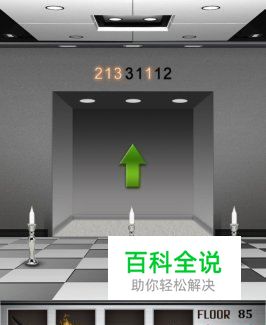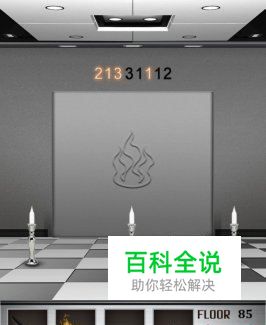在第八十五关中,电梯门上有一个火焰图形,电梯门的上方有几组数字,电梯门前有三支蜡烛。这里就需要用到之前捡的火把了,过关提示就在电梯门上方的数字中。数字分为亮的和暗的,所以,根据数字的亮和暗可以分为四组数字:213、31、1、12,亮的数字代表点燃、暗的数字代表熄灭。
