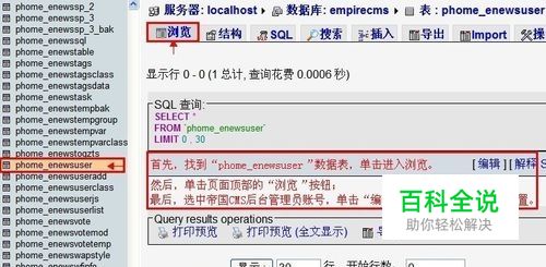 2.打开数据库名empirecms,修改数据库中的phome_enewsuser数据表,如图下图