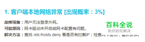 1. 客户端本地网络异常 [出现概率:3%] 故障现象:用户无法登录外网。 可能原因:网卡驱动未开启或网卡配置有问题。 解决方法:检查网卡驱动,重新安装。