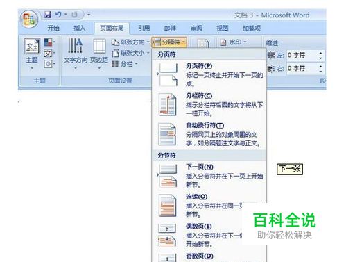 ②将光标置于第一章的开始处,执行“插入→分隔符”命令,选择“分节符类型”下的“下一页”,确定。以此类推,将其他章都进行分节操作。