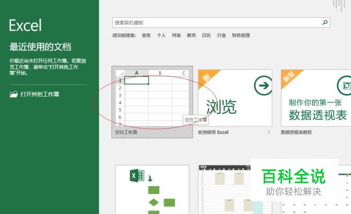 启动Excel 2016电子表格应用程序,如图所示点击屏幕右侧新建空白工作簿。