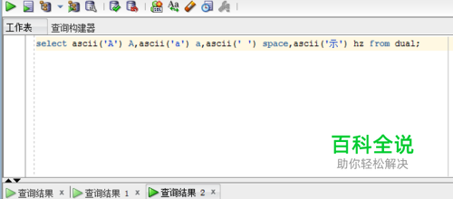 ASCII(x1) 【功能】:返回字符表达式最左端字符的ASCII 码值。 【参数】:x1,字符表达式 【返回】:数值型 【示例】 select ascii('A') A,ascii('a') a,ascii(' ') space,ascii('示') hz from dual; 【说明】在ASCII()函数中,纯数字的字符串可不用‘’括起来,但含其它字符的字符串必须用‘’括起来使用,否则会出错。 如果最左端是汉字,只取汉字最左半边字符的ASCII 码 【互反函数】:chr()