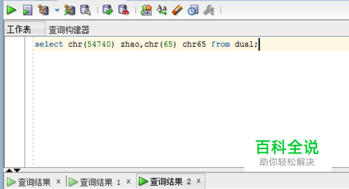 CHR(n1) 【功能】:将ASCII 码转换为字符。 【参数】:n1,为0 ~ 255,整数 【返回】:字符型 【示例】 select chr(54740) zhao,chr(65) chr65 from dual; 【互反函数】:ASCII