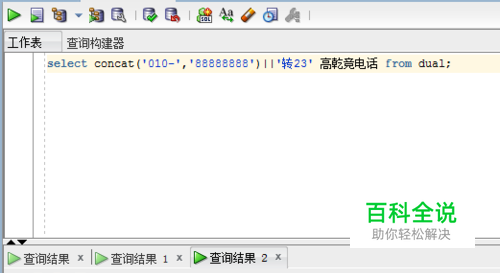 CONCAT(c1,c2) 【功能】连接两个字符串 【参数】c1,c2 字符型表达式 【返回】字符型 同:c1||c2 【示例】 select concat('010-','88888888')||'转23' 高乾竞电话 from dual;