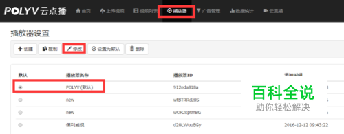 在进入保利威视的后台后,点击顶部功能列表的【播放器】,选择已有播放器(或创建新的播放器),点击【修改】,如下图:
