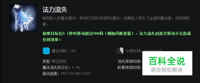 法力流失是对选取敌方英雄施放后,敌方英雄移动时会损失法力,如果法力为0则会眩晕。