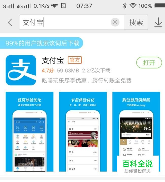 首先打开手机,在手机应用商城搜索栏输入:支付宝。点击下载安装到手机。