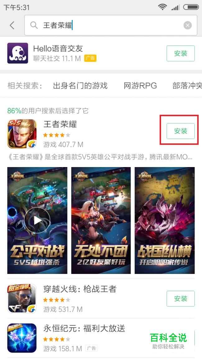 首先,在应用商店中搜索“王者荣耀”并点击安装。