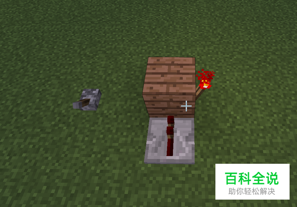 然后在火把上面放上方块,在中间放上红石,一个简易的红石脉冲就做好了