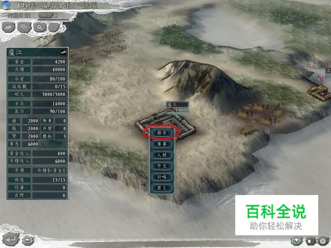 楼船是大型船只,除了个别拥有造船属性的城市开场可能会自带几艘,其他城市开场都是没有的。而有几艘一旦开战也远远无法满足战场需要。所以我们需要先进行楼船的生产。我们选择一个城市据点,可以看到有都市,军事,人才等选项。楼船的生产要落在都市里了。