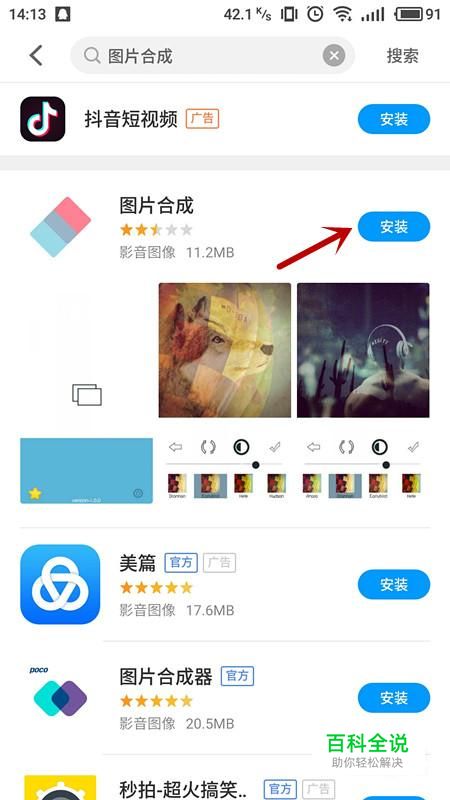 要想进行两张照片的合成,现在应用商店中搜索下载“图片合成APP”进行下载安装。