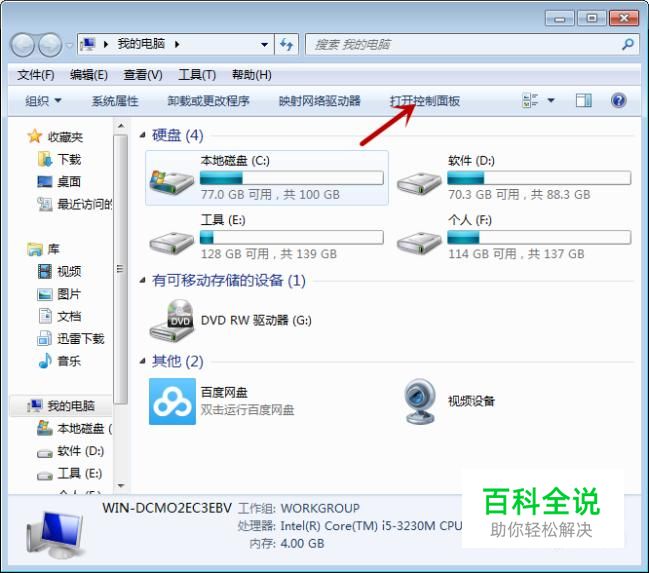 在电脑上,打开“我的电脑”,选择上方“打开控制面板”