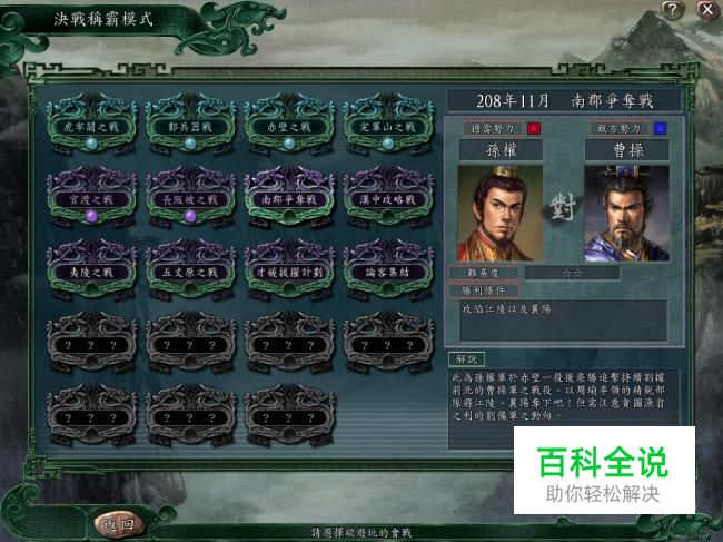 先在决战称霸模式里选择南郡争夺战,这场战役的背景是曹操赤壁之战战败后,孙权刘备曹操三家争夺荆州的,玩家操作的是孙权,所以 不能让刘备夺了荆州。
