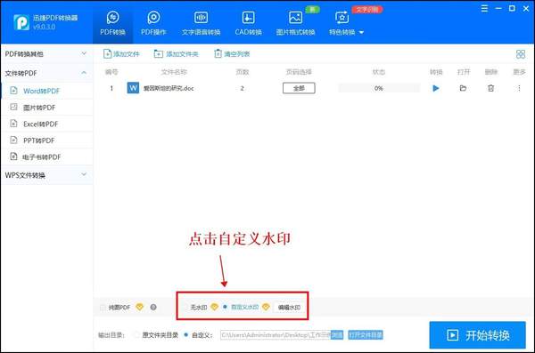 对于添加进来的文件,设置转换后将要保存的位置,如果还需要对PDF文件添加水印的话,可以点击下方的【自定义水印】。(注:不需要添加水印的话,点击开始【开始转换】即可。)