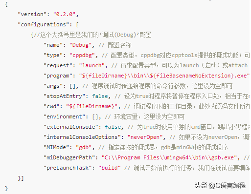 选择GDB,再选择gcc,你会发现终端那里跳转到了调试控制台,并且.vscode文件夹下面又多了一个launch.json文件,上文我们已经说过了.vscode文件夹存放当前工作文件夹的一些配置文件,例如task.json其实是编译运行的配置文件,这里的launch.json文件就是调试相关的配置文件,详解如下: