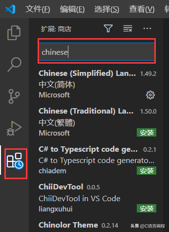 Chinese:中文汉化插件,VScode默认是英文界面,为了方便咱给他改成中文的。在搜索栏搜索Chinese,选择中文简体点击右下角的安装(我这里安装过了所以没有那个安装按钮)。