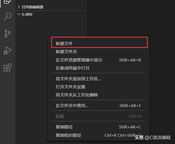 搞定之后我们来写一个C文件测试一下,点击左上角的文件-->打开文件夹-->选择一个空文件夹打开,然后右键-->新建文件: