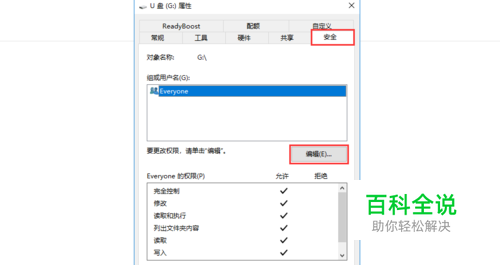 在打开的属性窗口上方找到并选中安全,在打开的安全选项卡找到并点击编辑。