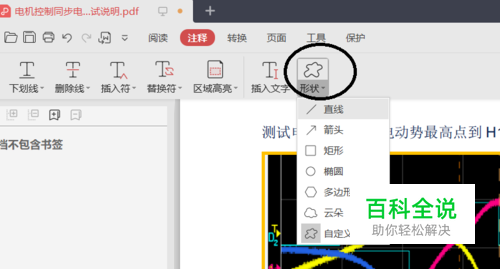 用WPS打开一个pdf文档,点击菜单栏的“注释”->“形状”,软件弹出绘图工具列表。