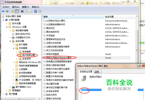 在开始-命令行或快捷键“WIN+R”输入“gpedit.msc”回车,在打开的本地组策略,删除“拒绝从网络访问此计算机”下GUEST权限。然后在“从网络访问此计算机”下添加GUEST权限。