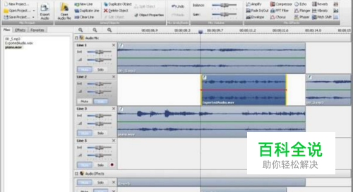 5、同时可以添加以下效果到音频文件中:放大,延迟,均衡器,淡入淡 出,镶边,翻转,规格化,反转,静音,延长,颤音,回声等等。