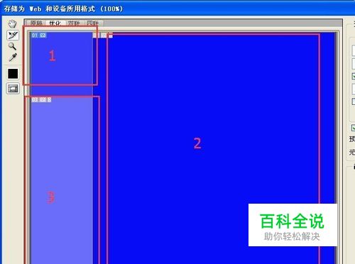 利用切片工具进行图片切割,切的部分会有虚线分辨的。(本文利用一张蓝色图片进行讲解,切片关于后期插入超链接所用,你切在哪个位置网页中点击你当时切的位置才会产生超链接效果的,当然你这张图片可以插入多个超连接,只要你多切几下就好了,至于怎么切,还得自己规划。)