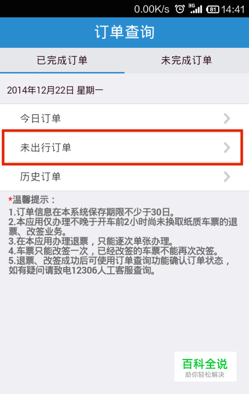 在“未出行订单”界面中,可以“按订票日期查询”或“按乘车日期查询”需要退票的信息。