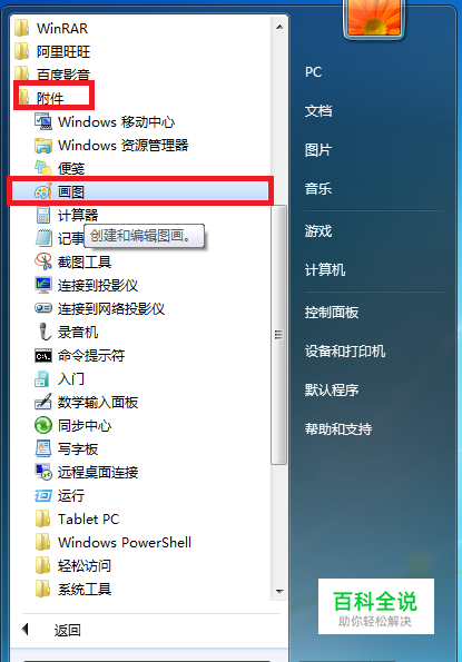 打开Win7系统下的画图工具,在开始——附件——画图工具
