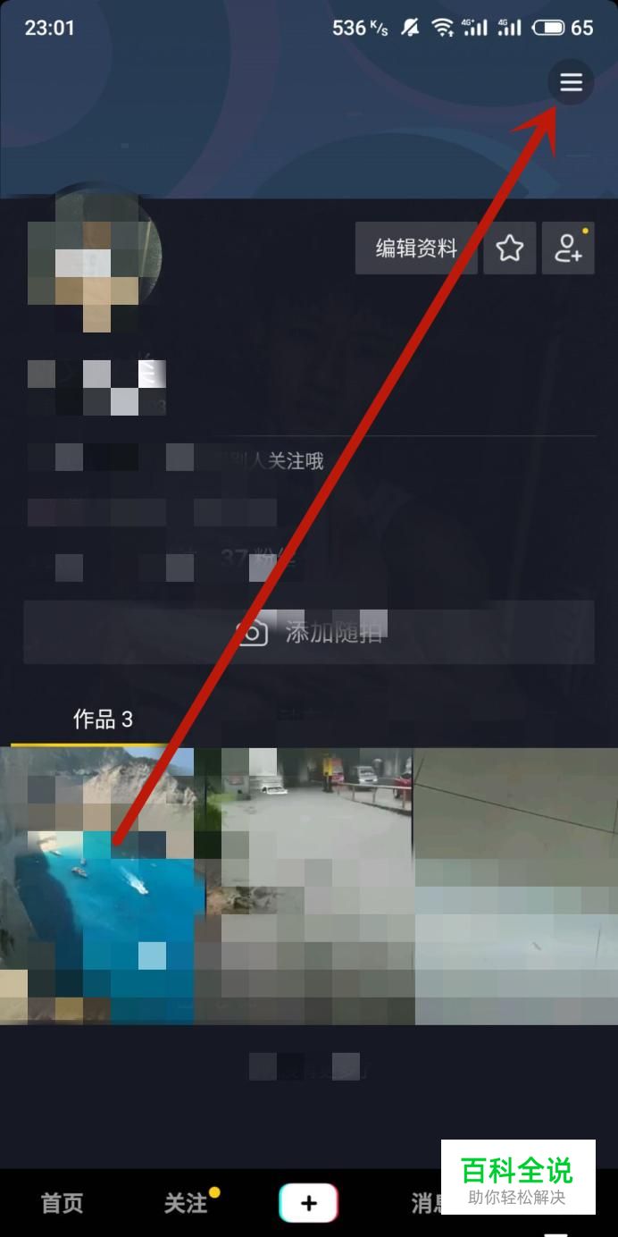 在抖音“我”页面点击图示位置的“三道横杠”,如图所示。